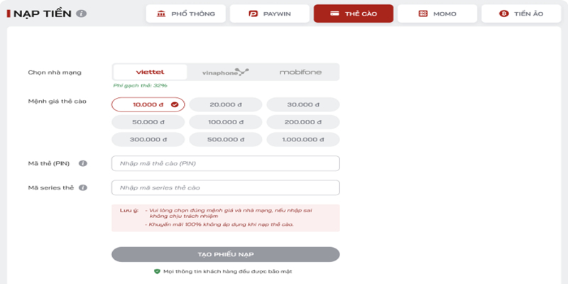 - Bước 2: Màn hình giao dịch sẽ yêu cầu người chơi chọn nhà mạng và mệnh giá tương ứng với thẻ cào mà bạn đang có. Tiếp theo, người chơi cần điền chính xác thông tin về mã thẻ và số seri trên thẻ vào ô quy định.