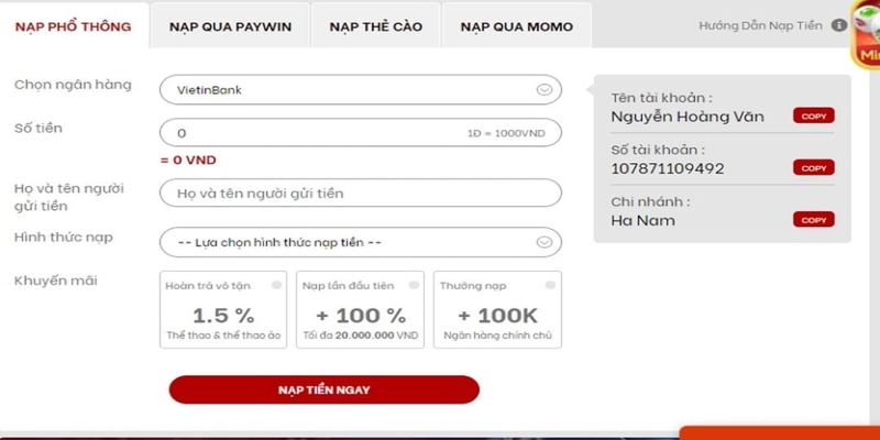 - Bước 2: Tại giao diện nạp của nhà cái, người chơi chọn “Nạp Phổ Thông”. Kế tiếp, người chơi nhập các thông tin người gửi vào phiếu giao dịch được hiển thị. Các thông tin bạn cần hoàn thiện gồm: Tên ngân hàng bạn đang sử dụng, số tiền muốn gửi, tên chủ tài khoản gửi tiền, chọn hình thức giao dịch và khuyến mãi muốn áp dụng. Sau đó click chọn “Nạp tiền ngay” ở cuối bảng thông tin giao dịch.